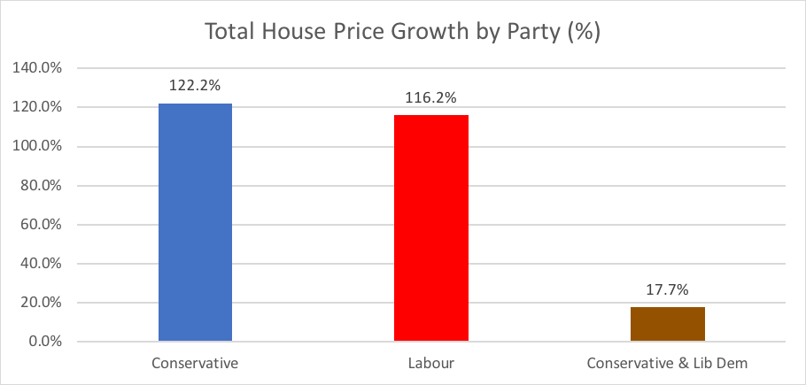 When looking at the average annual house price growth under each party, Labour once again comes out on top with an increase of 8.9%, with the Conservatives seeing an annual rate of growth of 6% in their first term and just 3.7% in their latest, or 5.8% when considered as a whole.